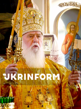Патріарх Київський і всієї Руси-України, Предстоятель Української православної церкви Київського патріархату (УПЦ КП) Філарет освячує відновлену церкву в селі Осники Лановецького району, у якому 1943 року фашисти розстріляли близько 200 жителів, а місцеву церкву спалили, Тернопільська область, 4 грудня 2005 року. Фото Олега Снітовського.
