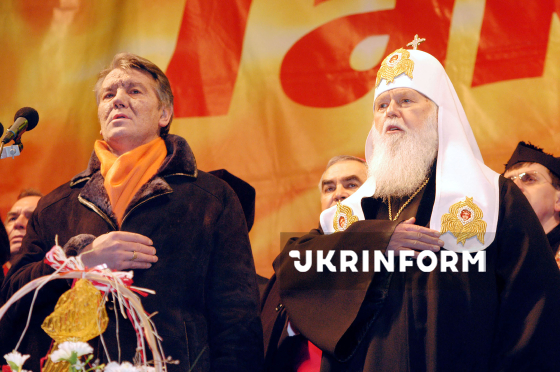Президент України Віктор Ющенко та Патріарх Київський і всієї Руси-України, Предстоятель Української православної церкви Київського патріархату (УПЦ КП) Філарет (зліва направо) із представниками столичної влади беруть участь у молитві за Україну на Майдані Незалежності у дні Помаранчевої революції, Київ, 24 січня 2005 року. Фото Юрія Рильчука.