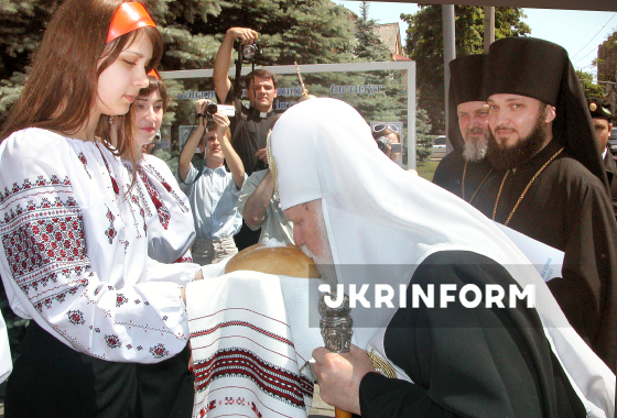 Патріарха Київського і всієї Руси-України, Предстоятеля Української православної церкви Київського патріархату (УПЦ КП) Філарета, який прибув освятити місця будівництва кафедрального собору імені Андрія Первозваного та притулку для дітей-сиріт, зустрічають хлібом-сіллю, Донецьк, 30 травня 2005 року. Фото Юлія Зозулі.