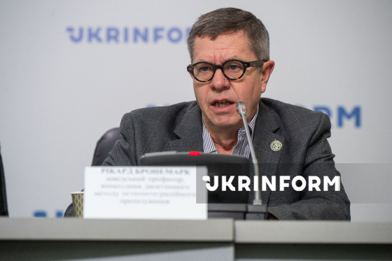 Шведський професор, винахідник двоетапного методу остеоінтеграційного протезування Рікард Бронемарк бере участь у пресконференції на тему: "Затвердження національного протоколу з остеоінтеграції в Україні у 2025 році. Перспективи остеоінтеграційного протезування в Україні у 2026 році", Київ, 12 грудня 2025 року.