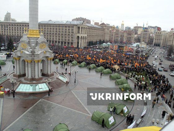 Учасники багатолюдного мітингу на підтримку кандидата в Президенти України від опозиції Віктора Ющенка біля наметового містечка на Майдані Незалежності протестують проти фальсифікації результатів президентських виборів після другого туру виборчих перегонів, Київ, 22 листопада 2004 року. Фото Володимира Фаліна.
