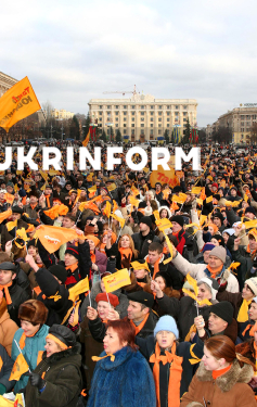 Учасники багатолюдного мітингу на підтримку кандидата в Президенти України від опозиції Віктора Ющенка після другого туру виборів протестують проти фальсифікації результатів президентських перегонів на користь провладного кандидата Віктора Януковича, Харків, 23 листопада 2004 року. Фото Андрія Авдошина.