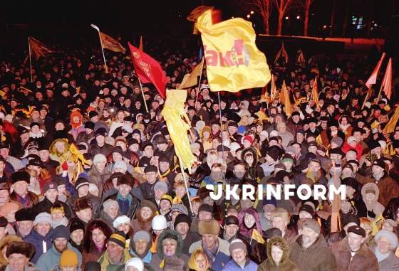 Учасники багатолюдного мітингу на підтримку кандидата в Президенти України від опозиції Віктора Ющенка після другого туру виборів протестують на Фестивальній площі проти фальсифікації результатів президентських перегонів, Запоріжжя, 26 листопада 2004 року. Фото Бориса Дворного.