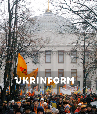 "Помаранчеві" мітингують біля будівлі Верховної Ради України, де проходить позачергове засідання парламенту, на якому депутати розглядають політичну ситуацію у державі, що склалась після фальсифікацій результатів другого туру президентських виборів, Київ, 27 листопада 2004 року. Фото Олега Маркевича.