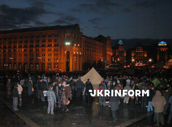 Прихильники кандидата в Президенти України від опозиції Віктора Ющенка, протестуючи проти фальсифікації результатів другого туру президентських виборів на користь провладного кандидата Віктора Януковича, розпочали мирну акцію громадянської непокори та встановили наметове містечко на Майдані Незалежності, Київ, 21 листопада 2004 року. Фото Володимира Самохоцького.
