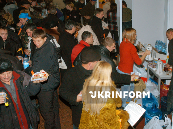 Прихильники кандидата в Президенти України від опозиції Віктора Ющенка, які протестують проти фальсифікації результатів другого туру президентських виборів, зайняли поверхи приміщення Палацу мистецтв "Український дім" на Європейській площі, куди з Майдану Незалежності перенесли штаб опору, медичний пункт, вуличну кухню, Київ, 25 листопада 2004 року. Фото Олега Маркевича.