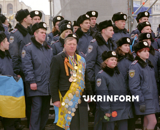 Заслужений майстер спорту, дворазовий чемпіон світу з фехтування Юрій Чиж (на першому плані) в гідному супроводі на Майдані Незалежності під час протестів проти фальсифікації результатів другого туру президентських виборів, Київ, 26 листопада 2004 року. Фото Олега Диканя.