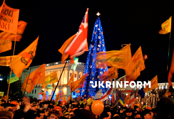 Прихильники кандидата у Президенти України від опозиції Віктора Ющенка після повторного голосування виборців, проведеного 26 грудня 2004 року, святкують біля новорічної ялинки перемогу свого обранця на Майдані Незалежності, Київ, 27 грудня 2004 року. Фото Олега Маркевича.
