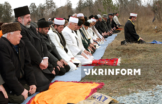 Учасники акції протесту, яку організував Меджліс після відмови Сімферопольської міськради мусульманській спільноті виділити землю під будівництво Соборної мечеті, провели намаз на місці майбутньої Соборної мечеті, Сімферополь, АР Крим, 23 січня 2008 року. Фото Арвідаса Шеметаса.