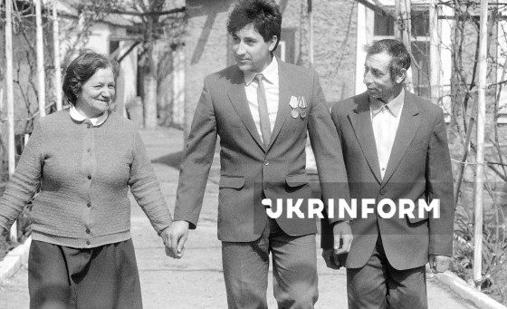 Воїн-інтернаціоналіст, татарин Сервер Асанов із матір’ю, депутатом селищної ради народних депутатів Марією Омелянівною та батьком Марленом Асановим ідуть вулицею селища Партизани, Генічеський район, Херсонська область, травень 1989 року. Фото Геннадія Ячменєва.