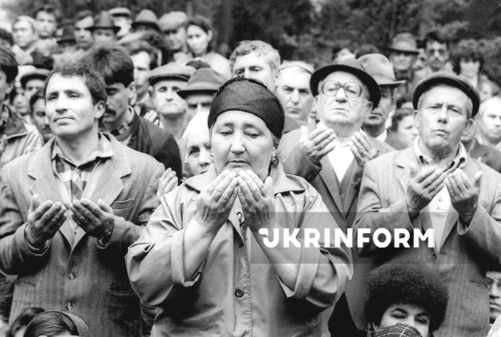 Кримські татари, які повернулись на історичну батьківщину, вшановують пам’ять жертв депортації кримськотатарського народу 1944 року під час траурного мітингу та молебню у привокзальному сквері біля пам’ятного знаку жертвам геноциду, Сімферополь, АР Крим, 18 травня 1993 року. Фото Олександра Обуховського.