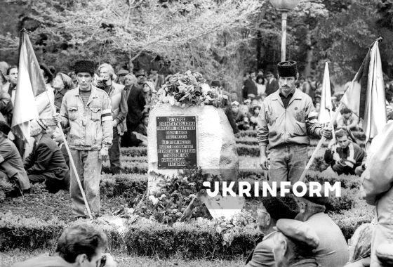 Кримські татари, які повернулись на історичну батьківщину, вшановують пам’ять жертв депортації кримськотатарського народу 1944 року під час траурного мітингу та молебню у привокзальному сквері біля пам’ятного знаку жертвам геноциду, Сімферополь, АР Крим, 18 травня 1993 року. Фото Олександра Обуховського.