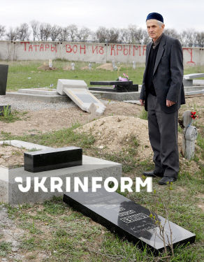 Кримський татарин стоїть серед понівечених могил на сплюндрованому мусульманському кладовищі, на жаль, факти відкритої наруги вандалів проти кримських татар непоодинокі на півострові, Сімферополь, АР Крим, 11 квітня 2008 року. Фото Арвідаса Шеметаса.