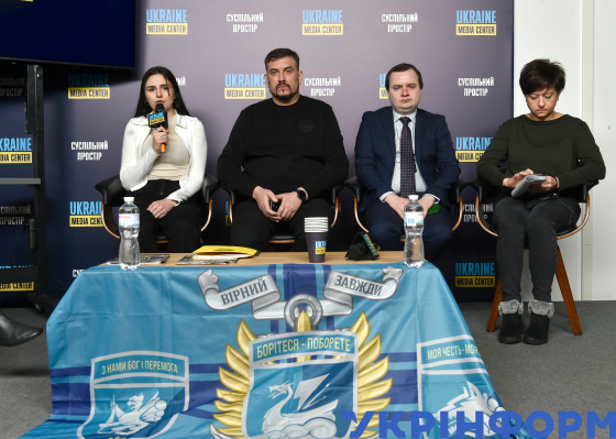 Голова та співзасновниця Асоціації̈ “Сила морської піхоти”, донька військовополоненого Анастасія Савова, секретар Координаційного штабу з питань поводження з військовополоненими України Дмитро Усов, радник департаменту міжнародного права МЗС Богдан Чумак і координаторка груп родин полонених та зниклих безвісти МІПЛ Олена Бєлячкова (зліва направо) під час пресконференції “1000 днів несвободи: як повернути українських морпіхів з полону” у Медіацентрі Україна, Київ, 8 січня 2025 року.