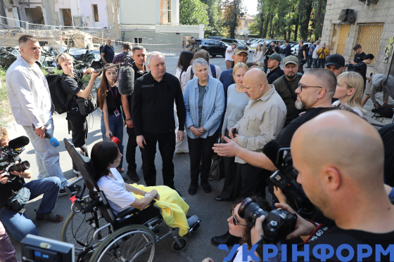 Генеральний прокурор України Андрій Костін, керівниця розслідуваннями міжнародних злочинів, вчинених в Україні, від Офісу прокурора Міжнародного кримінального суду Бренда Голліс, перекладачка і прокурор Міжнародного кримінального суду Карім Хан (зліва направо) спілкуються зі свідками ракетного удару, якого російські війська завдали по НДСЛ "Охматдит" 8 липня 2024 року, перед початком пресконференції на подвірʼї дитячої лікарні, Київ, 10 вересня 2024 року.