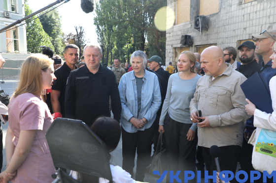 Генеральний прокурор України Андрій Костін, керівниця розслідуваннями міжнародних злочинів, вчинених в Україні, від Офісу прокурора Міжнародного кримінального суду Бренда Голліс, перекладачка і прокурор Міжнародного кримінального суду Карім Хан (зліва направо) спілкуються зі свідками ракетного удару, якого російські війська завдали по НДСЛ "Охматдит" 8 липня 2024 року, перед початком пресконференції на подвірʼї дитячої лікарні, Київ, 10 вересня 2024 року.