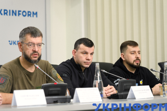 Ветеран війни Дмитро Попов, тренер Spartabox Артем Васьковський та керівник та засновник БО БФ "Центр складного ендопротезування, остеоінтеграції та біоніки", керівник реабілітаційного центру "Титанові", модератор В’ячеслав Запорожець (справа наліво) під час пресконференції на тему: "Після протезування - на ринг. Відновлення ветеранів", Київ, 24 січня 2025 року.