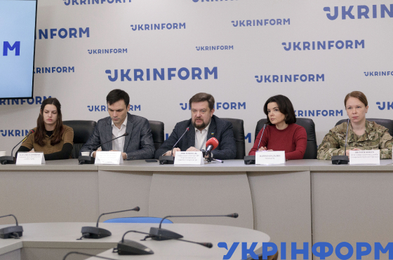 Начальниця медичної служби 3-ї окремої штурмової бригади Вікторія Ковач, телеведуча Марічка Падалко, генеральний директор СДУ "Український центр трансплант-координації" Дмитро Коваль, директор Департаменту високотехнологічної меддопомоги та інновацій МОЗ України Василь Стрілка та координаторка Патронатної служби Азову Наталія Соловйова (справа наліво) під час пресконференції на тему: "Здай кров - врятуй героя! Ситуація щодо донорства в Україні", Київ, 27 грудня 2023 року.