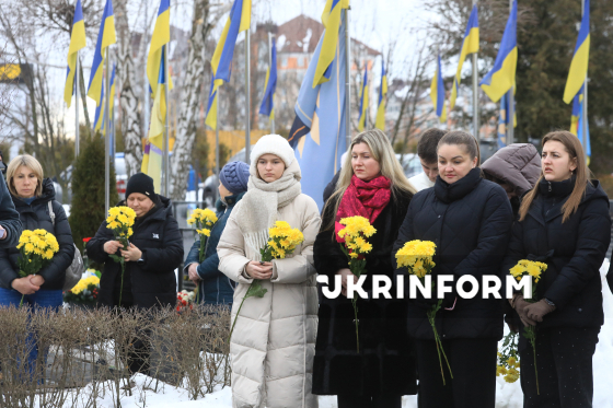 Жінки тримають у руках жовті квіти під час вшанування пам`яті загиблих військових і цивільних українців у четверті роковини повномасштабного вторгнення Росії в Україну на міському кладовищі у місті Буча, Бучанський район, Київська область, 24 лютого 2026 року.