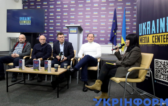 Директор видавництва "Фоліо" Олександр Красовицький, журналіст, письменник, сценарист, лавреат літературної нагороди "Премія Медічі" (Франція) за найкращий закордонний твір ("Сірі бджоли") Андрій Курков, заступник міністра культури та інформаційної політики з питань європейської інтеграції Тарас Шевченко, керівник Державного підприємства "Центр захисту інформаційного простору" Максим Удовиченко та модераторка Ольга Атаманова (зліва направо) під час презентації книги Андрія Куркова "Щоденник агресії 2" в Українському національному інформаційному агентстві "Укрінформ", Київ, 18 січня 2024 року.