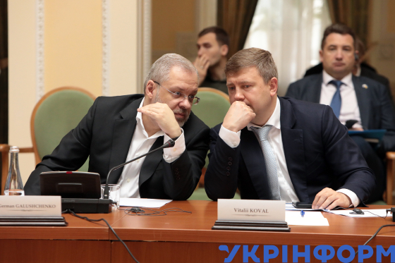 Міністр енергетики України Герман Галущенко, міністр аграрної політики та продовольства України Віталій Коваль (зліва направо) під час презентації економічного огляду України та огляду з питань доброчесності та протидії корупції Організації економічного співробітництва та розвитку у клубі Кабінету Міністрів України, Київ, 6 травня 2025 року.