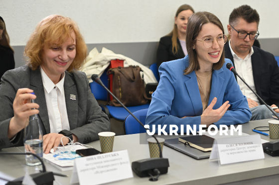 Заступниця виконавчого директора Міжнародного фонду “Відродження” Інна Підлуська та директорка Центру демократії та верховенства права Олеся Холопік (зліва направо) беруть участь у презентації V щорічного збірника історій “Громадянське суспільство, бізнес та влада — кращі практики співпраці”, Київ, 24 березня 2026 року.