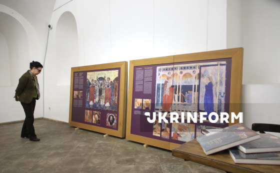 Відвідувачка роздивляється інформаційні стенди з фрагментами розписів Яна Генрика Розена під час презентації виставки “Вірменський кафедральний собор у Львові та його творці”, присвяченої реставрації поліхромних розписів XIV століття, у галереї “Хлібня” Національного заповідника “Софія Київська”, Київ, 24 березня 2026 року.