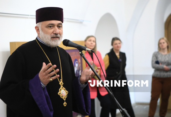 Голова Української єпархії Вірменської Апостольської церкви єпископ Маркос Оганесян виголошує промову під час презентації виставки “Вірменський кафедральний собор у Львові та його творці”, присвяченої реставрації поліхромних розписів XIV століття, у галереї “Хлібня” Національного заповідника “Софія Київська”, Київ, 24 березня 2026 року.