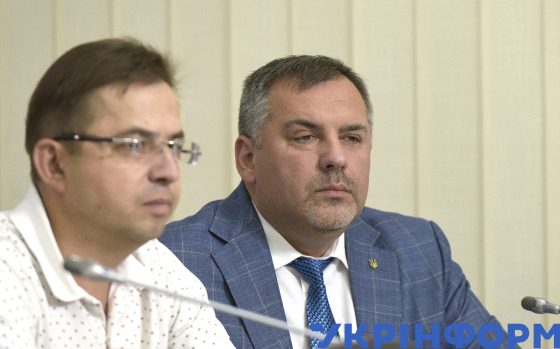 Перший заступник голови Державної екологічної інспекції України Дмитро Заруба (ліворуч) і директор Інституту водних проблем і меліорації НААН Михайло Яцюк під час пресконференції на тему: "Рік потому: наслідки підриву окупантами греблі Каховської ГЕС", Київ, 6 червня 2024 року.