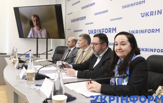 Голова Бюро ЮНЕСКО в Україні К’яра Децці Бардескі, голова Комітету ВРУ з питань гуманітарної та інформаційної політики, модератор Микита Потураєв, т.в.о. міністра культури та інформаційної політики України Ростислав Карандєєв, начальник відділу ЮНЕСКО Міністерства закордонних справ України Артур Оганов і заступниця голови Комітету ВРУ з питань гуманітарної та інформаційної політики Євгенія Кравчук (онлайн) (справа наліво) під час презентації та експертного обговорення на тему: "Аналіз та синхронізація українського законодавства у сфері охорони культурної спадщини", Київ, 13 березня 2024 року.