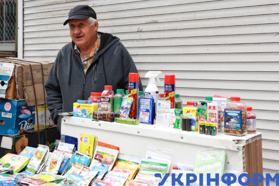 Продавець Анатолій, якого рік тому поранило під час чергового обстрілу російськими військами міста, торгує добривами та хімічними засобами для боротьби зі шкідниками та хворобами рослин, на Центральному ринку прифронтового Херсона, 2 жовтня 2025 року.