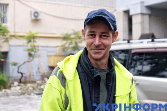 Начальник чергової робочої бригади Херсонської обласної комунальної аварійно-рятувальної служби (ХОКАРС) Константин Бодрик відповідає на запитання журналістів під час демонтажу решток аварійної плити з даху житлового будинку, пошкодженого внаслідок влучання російського дрона, у прифронтовому Херсоні, 2 жовтня 2025 року.