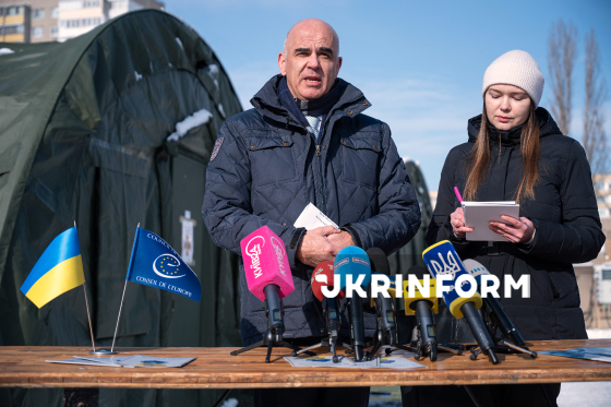 Генеральний секретар Ради Європи Ален Берсе проводить брифінг для журналістів біля наметів пункту незламності у Деснянському районі, які він відвідав у межах офіційного візиту до Києва, 17 лютого 2026 року. Європейський політик представив нові кроки Ради Європи на підтримку України. Йдеться про притягнення Росії до відповідальності за злочин агресії проти України, зокрема Міжнародну компенсаційну комісію та Спеціальний трибунал, а також сприяння успішному вступу України до Європейського Союзу.