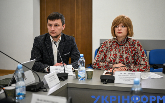 Начальник відділу методологічного забезпечення енергоефективності Міністерства розвитку громад та територій України Артур Обідник та координаторка житлово-комунальних програм Громадянської мережі "ОПОРА" Тетяна Бойко беруть участь у засіданні "круглого столу" на тему: "Імплементація EPBD в Україні. BIM-технології та nZEB. Бар’єри та здобутки", Київ, 27 жовтня 2025 року.