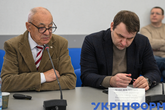 Президент Академії будівництва України Іван Назаренко та генеральний директор AIMM Group, член Національної спілки архітекторів України Максим Мятко (зліва направо) беруть участь у засіданні "круглого столу" на тему: "Імплементація EPBD в Україні. BIM-технології та nZEB. Бар’єри та здобутки", Київ, 27 жовтня 2025 року.