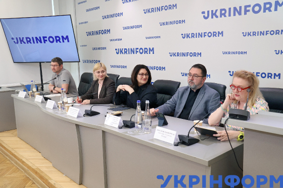 Член Національної ради України з питань телебачення і радіомовлення Олександр Бурмагін, народна депутатка України, голова Підкомітету з питань інформаційної політики та європейської інтеграції Комітету ВРУ з питань гуманітарної та інформаційної політики Євгенія Кравчук, голова Національної Ради з питань телебачення та радіомовлення Ольга Герасим’юк, народний депутат України, голова Комітету ВРУ з питань гуманітарної та інформаційної політики Микита Потураєв та директорка міжнародної організації "Інтерньюс Нетворк" Джилліан МакКормак (зліва направо) під час "круглого столу" на тему: "Рік імплементації Закону України "Про медіа": здобутки та виклики" в Українському національному інформаційному агентстві "Укрінформ", Київ, 10 квітня 2024 року.