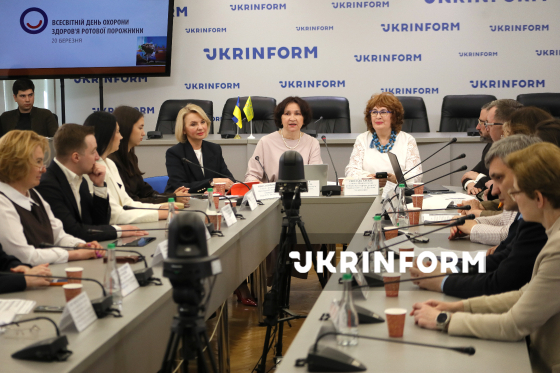 Доцентка Національного медичний університету імені О. О. Богомольця Ірина Скрипник, професорка, президентка ГО "Асоціація стоматологів України" Ірина Мазур та представниця Національного університету охорони здоров’я України імені П. Л. Шупика Світлана Хлєбас (у центрі зліва направо) беруть участь у засіданні "круглого столу" на тему: "Здорова усмішка – здоров’я українців" до Всесвітнього дня здоров’я ротової порожнини в Українському національному інформаційному агентстві "Укрінформ", Київ, 20 березня 2026 року.