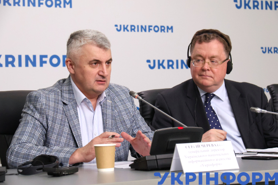 Генеральний директор Українського національного інформаційного агентства "Укрінформ" Сергій Череватий (ліворуч) і голова Представництва НАТО в Україні Патрік Тернер під час засідання "круглого столу" на тему: "Україна - НАТО 2024: від зміцнення партнерства до пошуку шляхів безпеки", Київ, 11 грудня 2024 року.