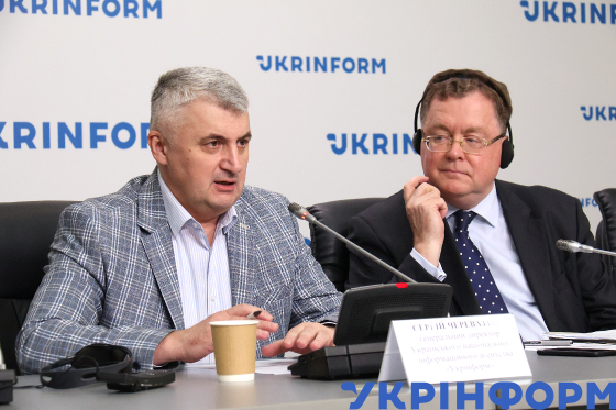 Генеральний директор Українського національного інформаційного агентства "Укрінформ" Сергій Череватий (ліворуч) і голова Представництва НАТО в Україні Патрік Тернер під час засідання "круглого столу" на тему: "Україна - НАТО 2024: від зміцнення партнерства до пошуку шляхів безпеки", Київ, 11 грудня 2024 року.