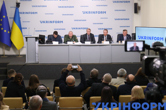 Керівник проєкту Інформаційна оборона Фонду "Відкрита політика", міністр молоді та спорту України (2014-2019) Ігор Жданов, полковник, директор департаменту міжнародного оборонного співробітництва МОУ Геннадій Коваленко, керівник Центру дослідження Росії, міністр закордонних справ України (2007–2009) Володимир Огризко, заступник директора департаменту ЄС і НАТО, начальник відділу НАТО МЗС України Максим Ємельянов і голова Громадської ради при МЗС України, голова Громадської ліги Україна-НАТО, старший лейтенант ЗСУ Сергій Джердж (зліва направо) під час засідання "круглого столу" на тему: "Україна - НАТО 2024: від зміцнення партнерства до пошуку шляхів безпеки", Київ, 11 грудня 2024 року.