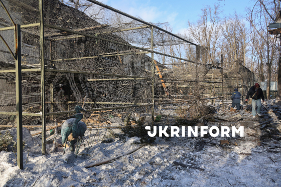 Пошкоджені внаслідок російського обстрілу КАБом вольєри для птахів у Фельдман-Екопарку, Харківська область, 1 січня 2026 року. Внаслідок російського удару керованою авіабомбою по території приватного екопарку поранено волонтерку та левів, загинули екзотичні птахи (папуги, фазани), зруйновано зимові приміщення для птахів та хижаків. Через близькість до фронту екопарк неодноразовано потерпав від російських атак.
