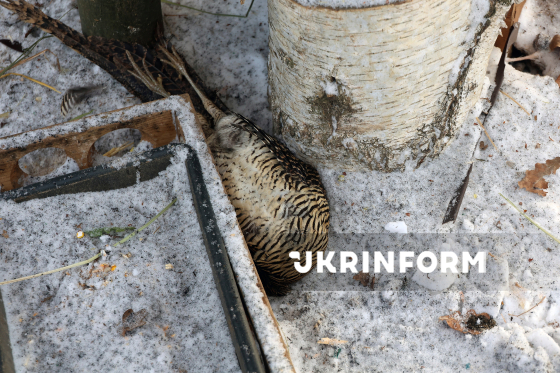 Загиблий внаслідок російського обстрілу КАБом золотий фазан лежить у вольєрі на території Фельдман-Екопарку, Харківська область, 1 січня 2026 року. Внаслідок російського удару керованою авіабомбою по території приватного екопарку поранено волонтерку та левів, загинули екзотичні птахи (папуги, фазани), зруйновано зимові приміщення для птахів та хижаків. Через близькість до фронту екопарк неодноразовано потерпав від російських атак.