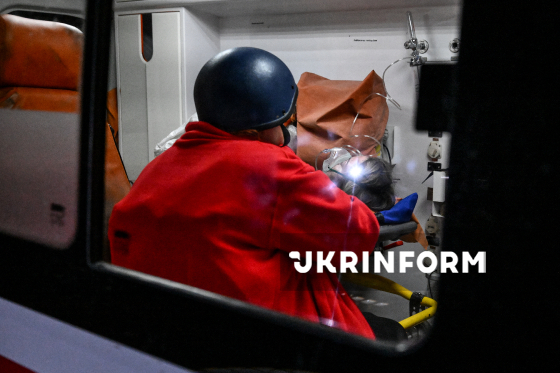 Жінка, поранена внаслідок російського обстрілу, лежить із кисневою маскою на обличчі у кареті екстреної медичної допомоги, Запоріжжя, 24 березня 2026 року. Вночі російські війська атакували місто ударними дронами та балістичними ракетами. Внаслідок обстрілу одна людина загинула, ще дев`ятеро дістали поранення.