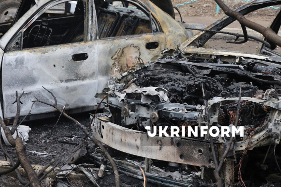 Автомобілі, знищені внаслідок російського обстрілу ударними безпілотниками, Харків, 25 березня 2026 року. Російська армія атакувала безпілотниками Новобаварський та Холодногірський райони міста, Внаслідок обстрілу пошкоджені житлові будинки, знищені автомобілі, постраждали семеро людей, серед них - дитина.