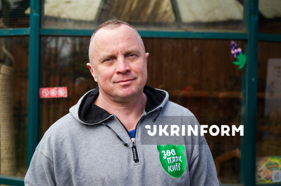 Генеральний директор Київського зоопарку Кирило Трантін позує для фото на тлі вольєри, де утримується рись Степан, Київ, 2 квітня 2026 року. Мешканець Київського зоопарку став зіркою соцмереж через свою зовнішність. Фахівці пояснюють, що врятований у 2024 році 8-річний хижак більшу частину життя провів у клітках ресторанів, кафе та приватних оселях. Саме це, ймовірно, і стало причиною його надмірної ваги, яку важко позбутися через особливості здоров’я та вік тварини. Нині його стан постійно контролюють працівники зоопарку та ветеринари, забезпечуючи індивідуальний догляд.