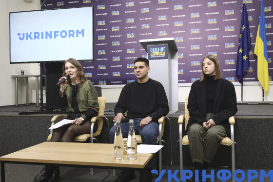 Співзасновниця та керівниця Інституту інноваційного врядування, модераторка Анна Мисишин, юридичний консультант з розвитку правового регулювання ШІ при Міністерстві цифрової трансформації України Олег Дубно та експертка Інституту інноваційного врядування з етики штучного інтелекту Валерія Майборода (справа наліво) під час пресконференції на тему: "Виявлення та протидія російській пропаганді за допомогою новітніх технологій: презентація посібника для творців контенту" у Медіацентрі Україна - Укрінформ, Київ, 13 березня 2024 року.