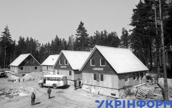 Робітники комплексної бригади Ризького тресту великопанельного будівництва з Латвії монтують котеджі для працівників електростанції, евакуйованих після аварії на ЧАЕС із зони відчуження, Славутич, Київська область, квітень 1987 року. Фото Володимира Репіка.