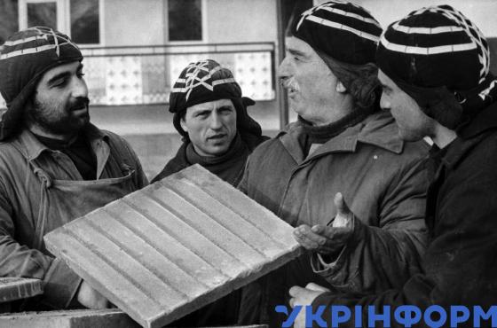 Будівельники тресту "Тбілісіміськбуд" із Грузії Тенгіз Джабнідзе, Серго Ратіані, Автанділ Кочітідзе і Бондо Ткешеліадзе (зліва направо) на будівництві нового міста Славутича, Київська область, грудень 1987 року. Фото Костянтина Ковпака та Юрія Олійника.