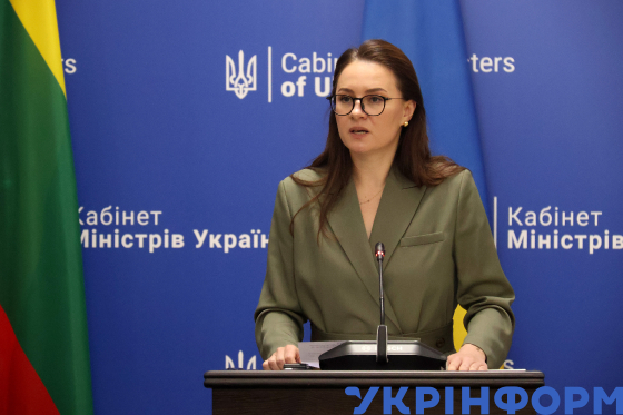 Прем’єр-міністр України Юлія Свириденко виступає з промовою під час спільного з Прем’єр-міністром Литви Інгою Ругінене, яка прибула до столиці з офіційним візитом, брифінгу, в межах якого оголосили про створення нової ініціативи з допомоги та реабілітації раніше викрадених Росією українських дітей та їх родин "Діти насамперед. Захистимо майбутнє України" Київ, 6 жовтня 2025 року.