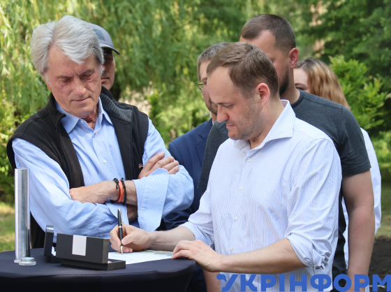 Третій президент України Віктор Ющенко (ліворуч), віцепрем`єр-міністр з відновлення України — міністр розвитку громад та територій України Олексій Кулеба, який пише послання для капсули часу, під час старту реалізації проєкту з будівництва Ортопедо-травматологічного центру з ортезо-протезною лабораторією на базі Київської обласної клінічної лікарні № 2, Київ, 7 червня 2025 року.